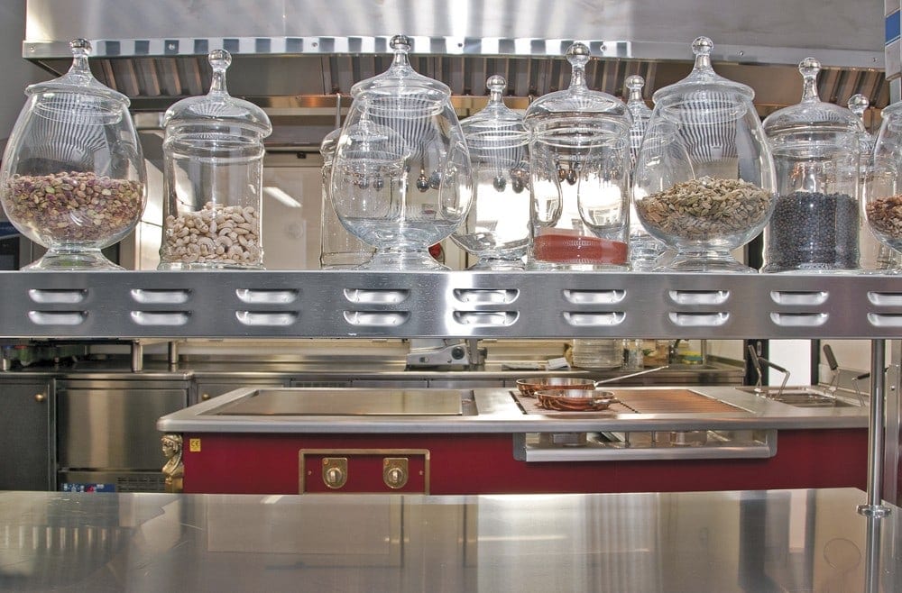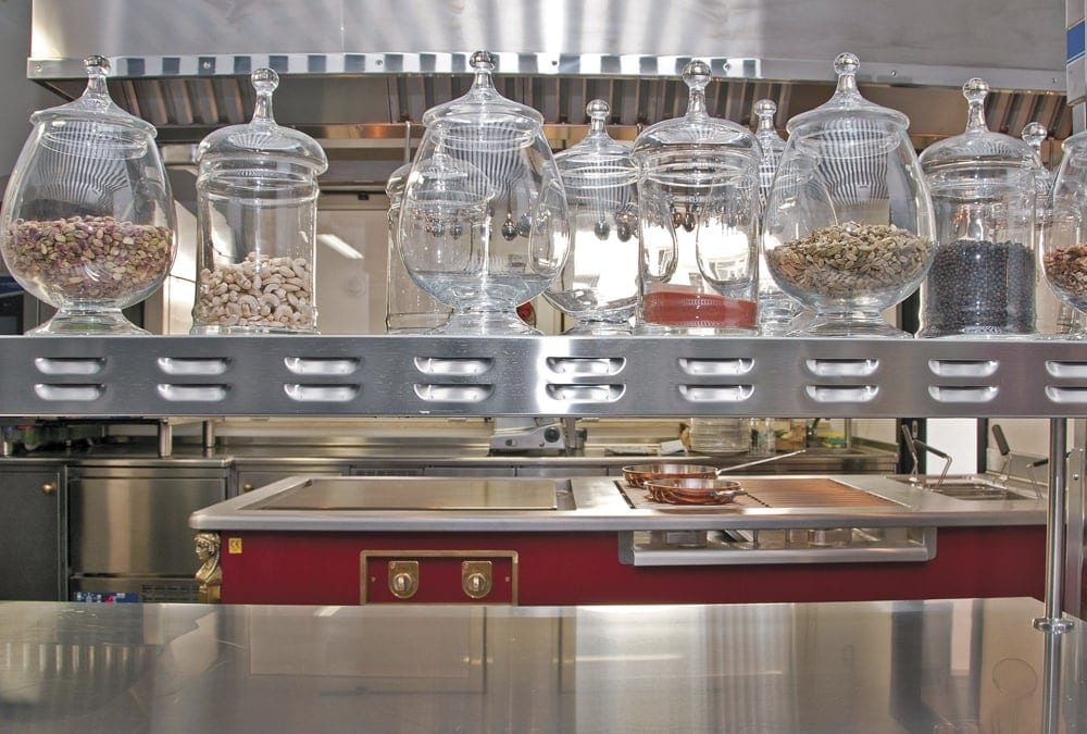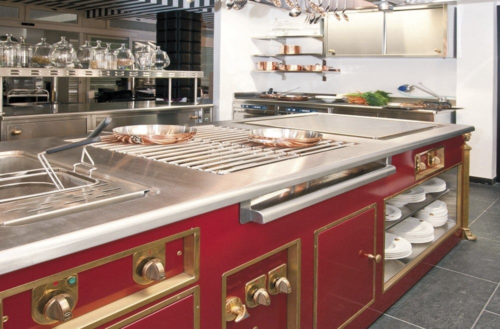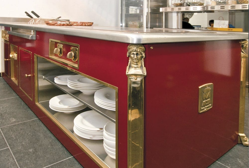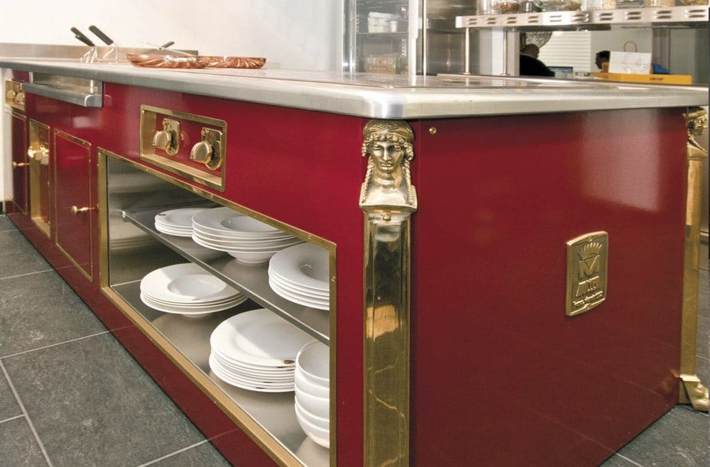 Boma, a refined and exclusive atmosphere, presenting a Molteni limited edition at the center of its kitchen, as unique as a signature dish. The visible Molteni boasts a red enameled body with shiny brass elements in addition to the peculiar side columns shaped as a caryatid head and lion’s paws.